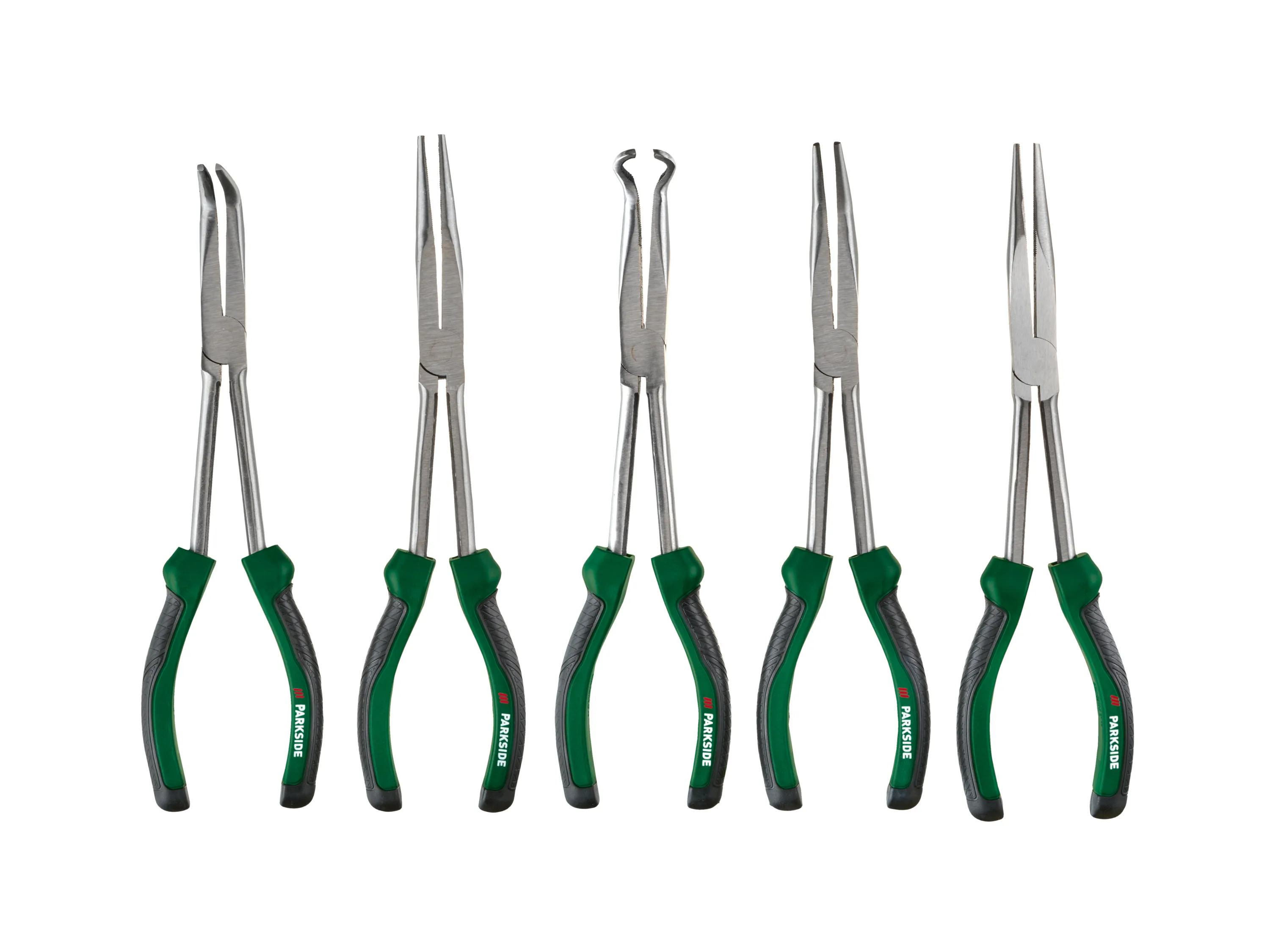 Das Set besteht aus einem 5-teiligen Langbeckzangen-Satz und einem 3-teiligen Zangen-Set in einer gemeinsamen Aufbewahrungstasche. Die Zangen verfügen über rutschhemmende 2-Komponenten-Griffe und kombinieren Kunststoffgriffteile mit gehärtetem Karbonstahl bei den Zangenhälften. Im Langbeckzangen-Set sind Varianten mit gerader Spitze, mehreren abgewinkelten Ausführungen und einer Ringspitze enthalten; das ergänzende Zangen-Set umfasst zwei Spitzzangen in gerader und 45°-Ausführung sowie eine gerade Flachzange. Die Längen der Werkzeuge variieren zwischen ca. 26 cm und 34 cm, die Sets haben unterschiedliche Gesamtgewichte. Die Ausführung ist auf größere Reichweite und Zugänglichkeit in beengten Bereichen ausgelegt, die Tasche dient der ordentlichen Aufbewahrung und dem Transport.