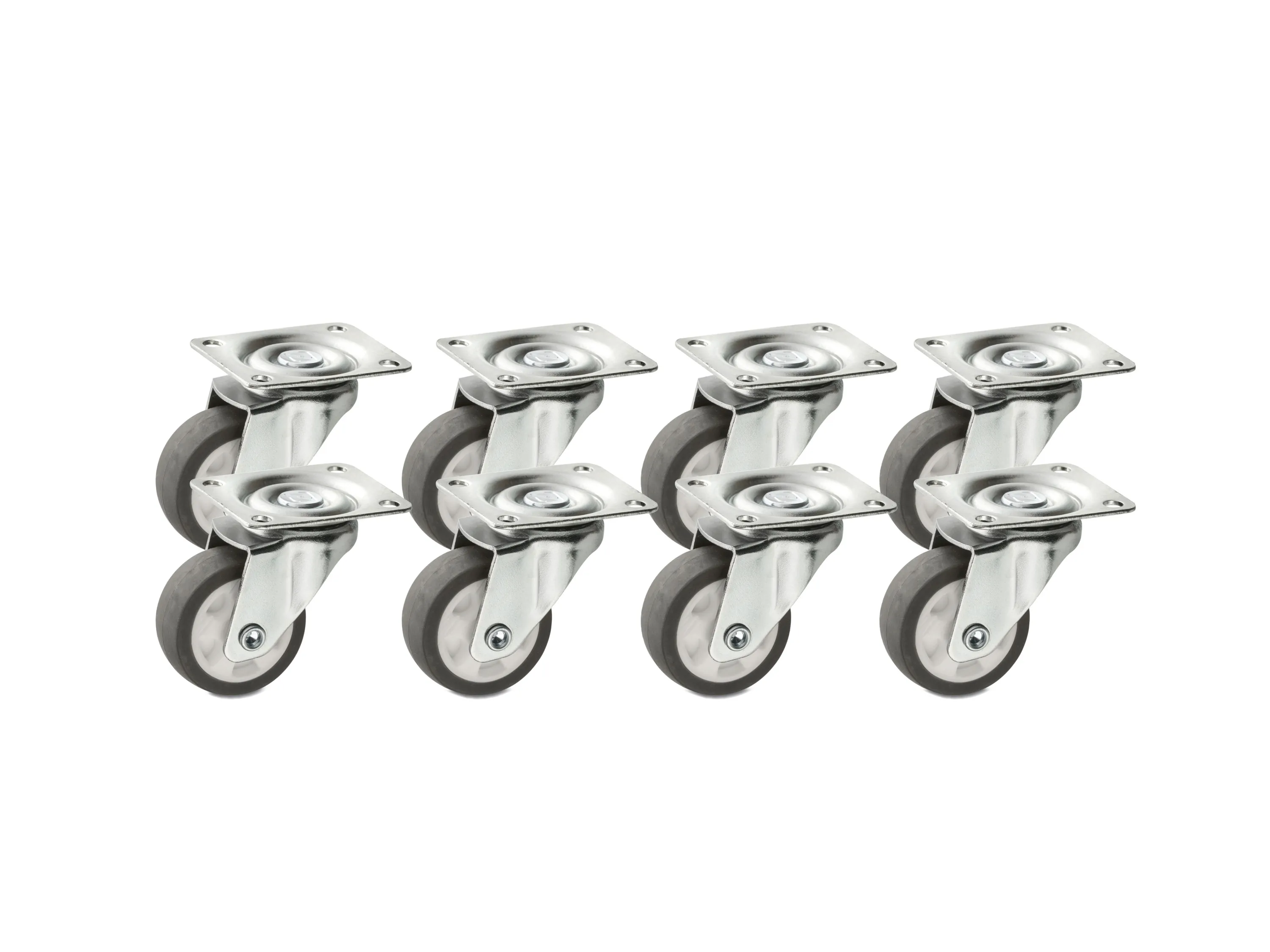 Die Zubehörsets umfassen Lenkrollen-, Möbelrollen- und Transportrollenvarianten aus verzinktem Metall und Kunststoff mit unterschiedlichen Raddurchmessern und Tragfähigkeiten. Die Lenkrollen verfügen über eine Soft-Lauffläche für empfindliche Böden; die Möbelrollen sind teilweise mit Feststellfunktion ausgestattet und ebenfalls mit bodenschonender Lauffläche versehen. Die Transportrollen besitzen großvolumige, leichtlaufende Räder für robuste Böden und kombinieren feste und drehbare Rollen mit Feststellfunktion. Alle Ausführungen sind zertifiziert nach dem Recycled Claim Standard und enthalten recycelte Kunststoffeanteile gemäß Herstellerangaben. Lieferumfang, Stückzahl und Gewichte sind für die jeweiligen Sets separat angegeben.